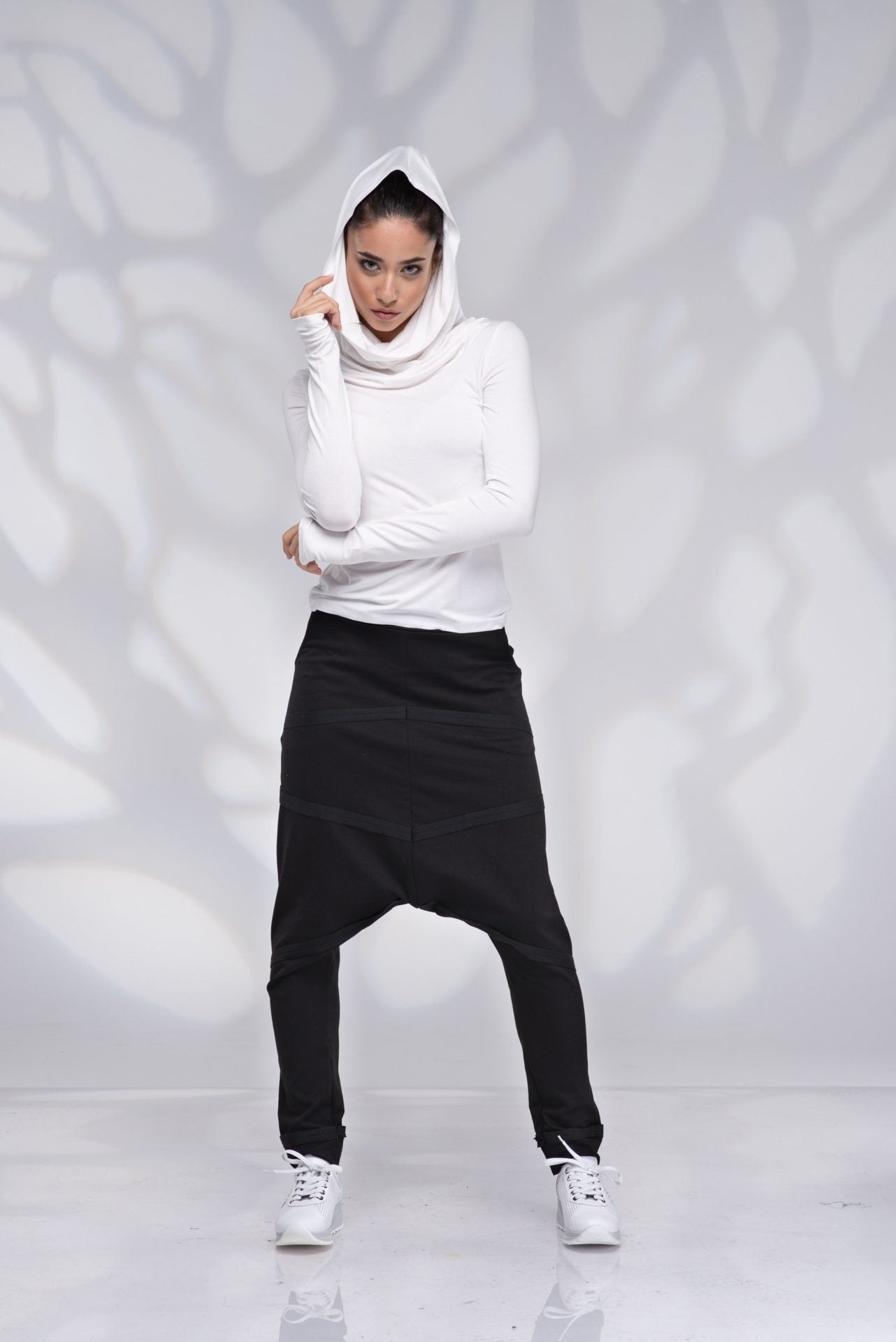 White Cowl Hood Fitted Top with Extra Long Thumb Hole SleevesWhite Cowl Hood Fitted Top with Extra Long Thumb Hole Sleeves