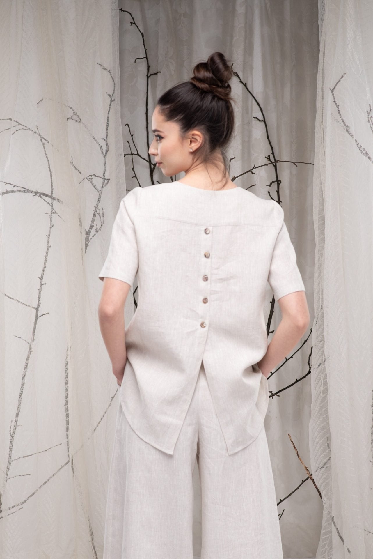 Linen Edwardian Button Up Collared Puff Sleeve Blouse