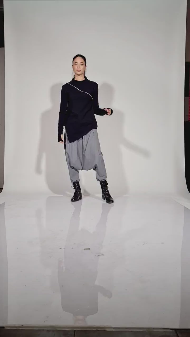 Asymmetrical Black Off Shoulder Fitted Tunic Blouse with Zipper and Thumb Holes