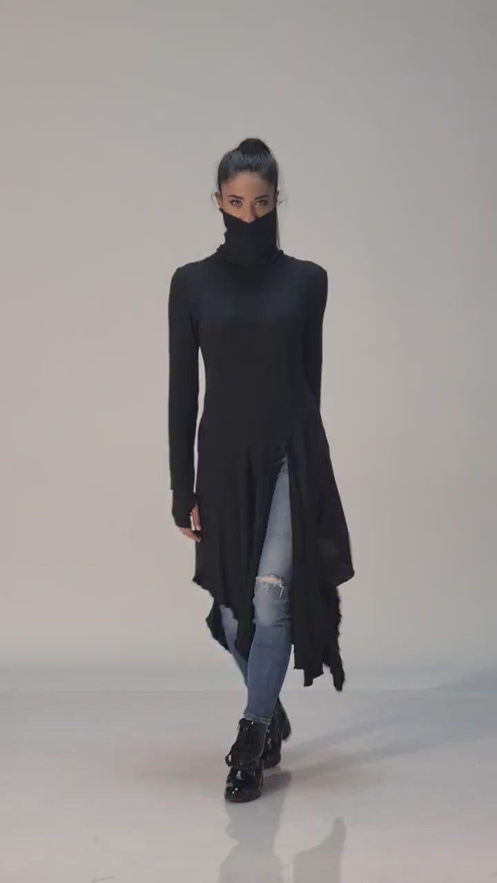 Black Tunic Sweater - Long Turtleneck Asymmetrical High Low Draped Top