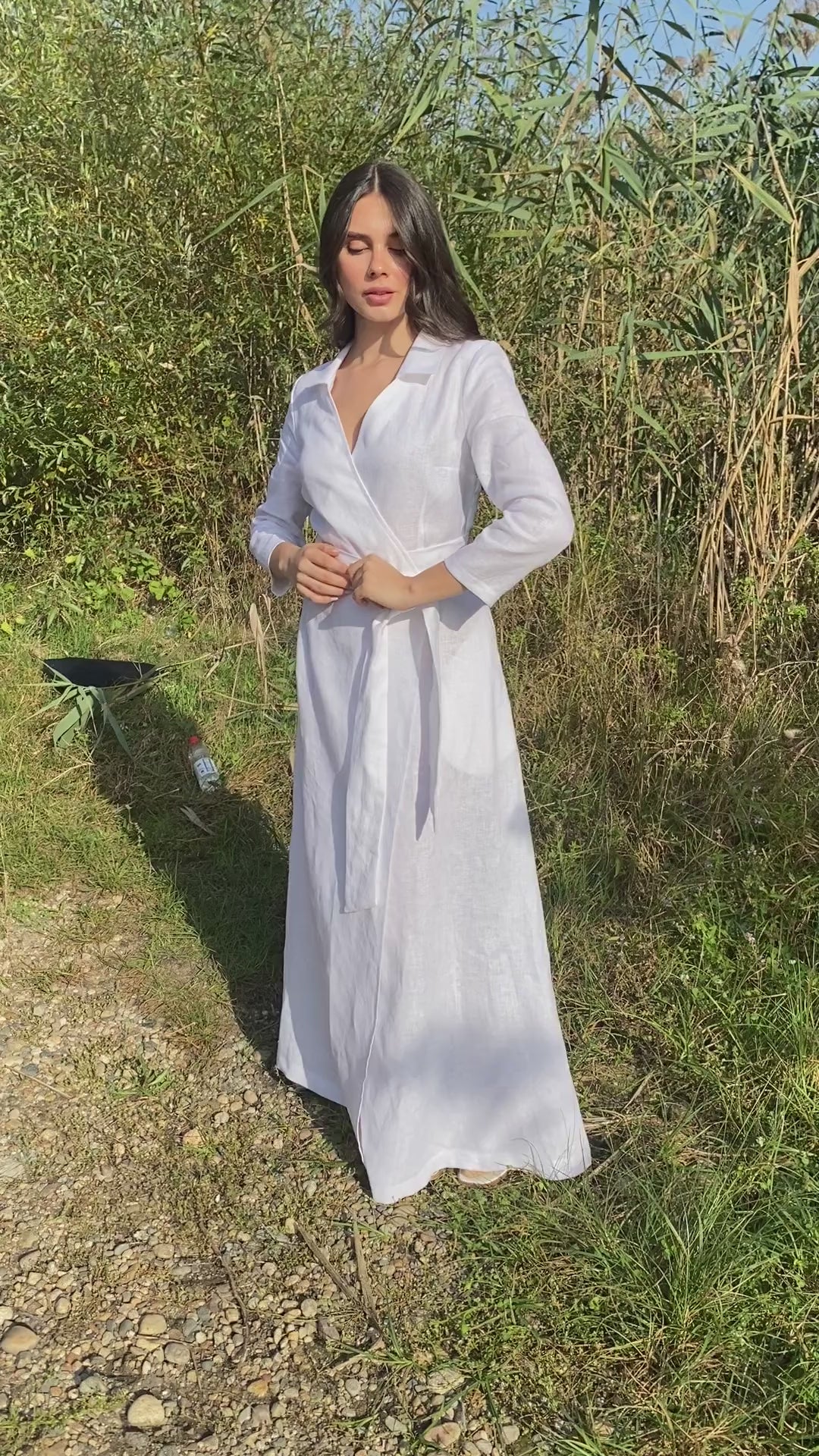 Classic White Linen Wrap Dress with V-Neck and Tie Waist