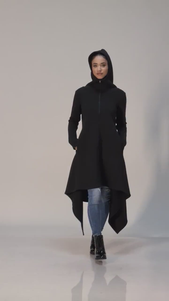 Cotton Hooded Maxi Coat Long Zip up Black Gothic Jacket