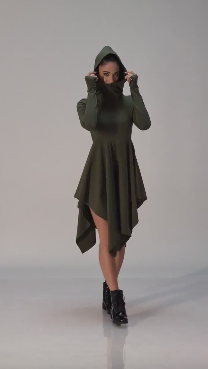 Hooded Winter Asymmetrical Dress with Thumb Holes