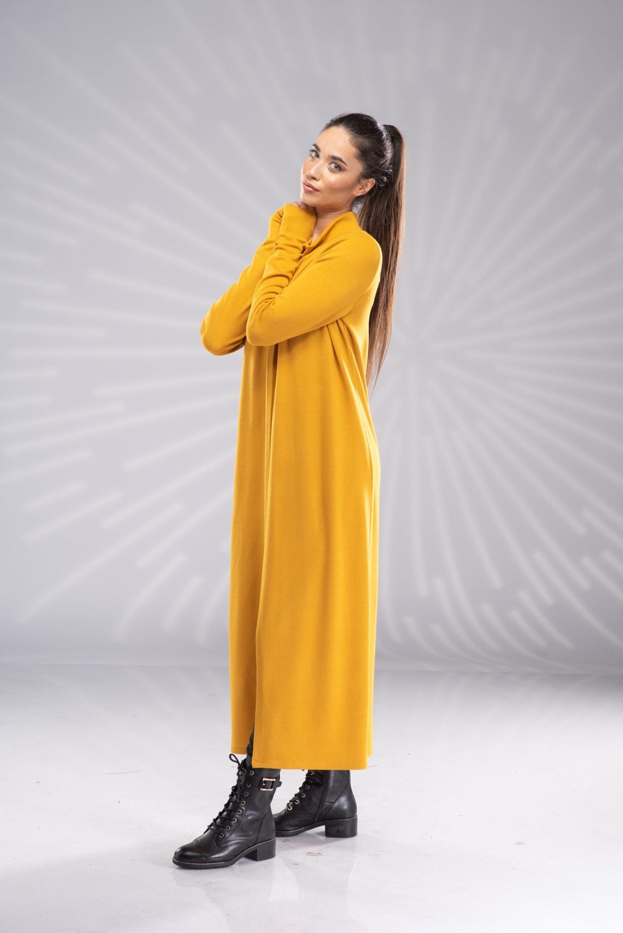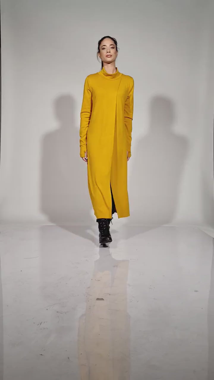 Knit Mustard Maxi Tunic Sweater Dress Side Slit with Turtleneck