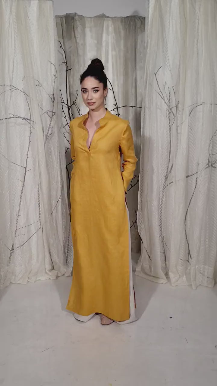 Long Linen Tunic Dress with Two Side Slits and Long Sleeves