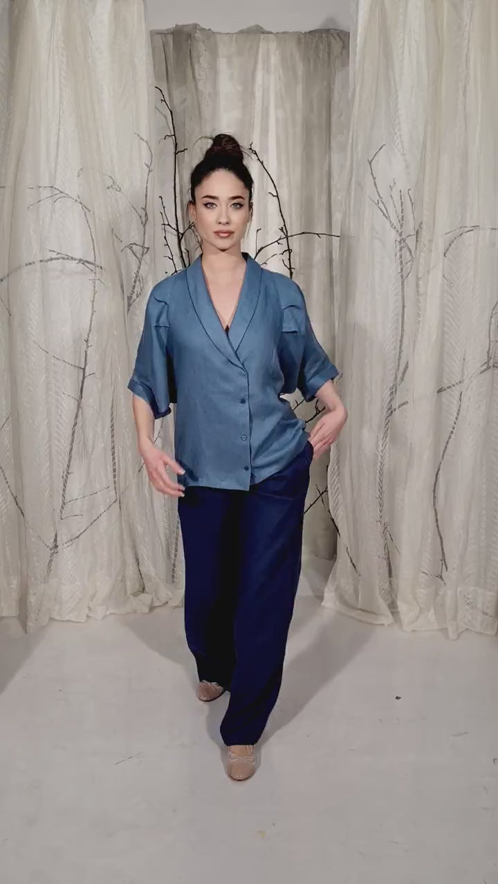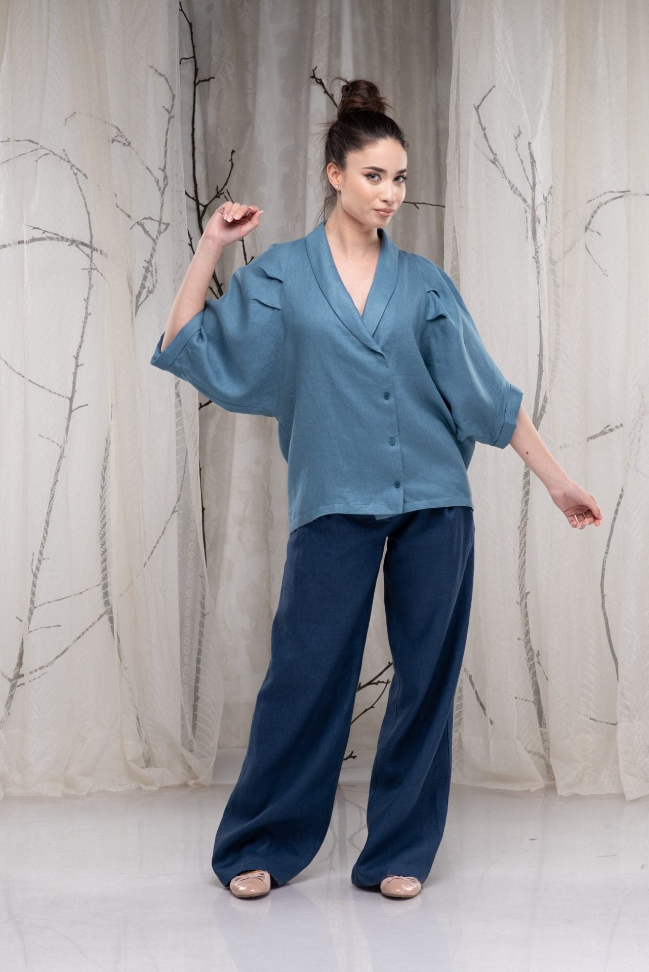 Loose Linen Shawl Collar Blouse with Short Kimono Sleeves