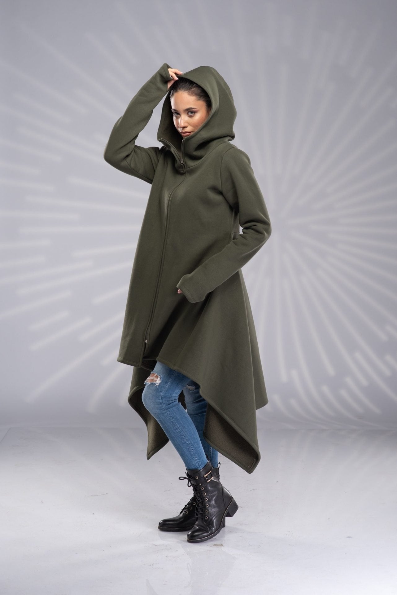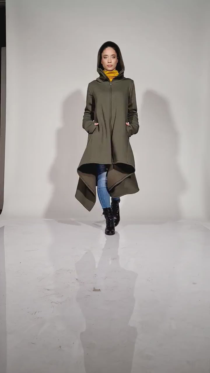 Maxi Asymmetrical Hoodie Cowl Neck Cotton Coat with Zipper