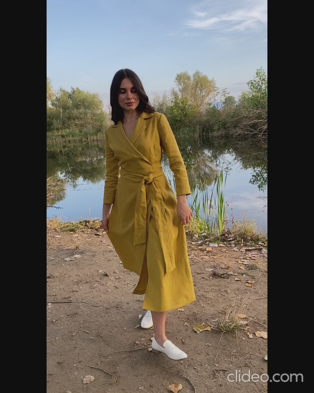 Mustard Yellow Wrap Linen Midi Dress with Long Sleeve and Shawl Collar