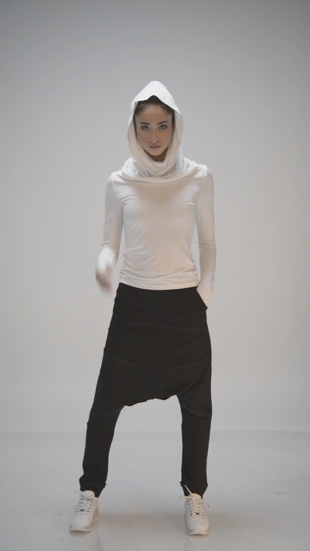 - White long-sleeve top with a built-in hood