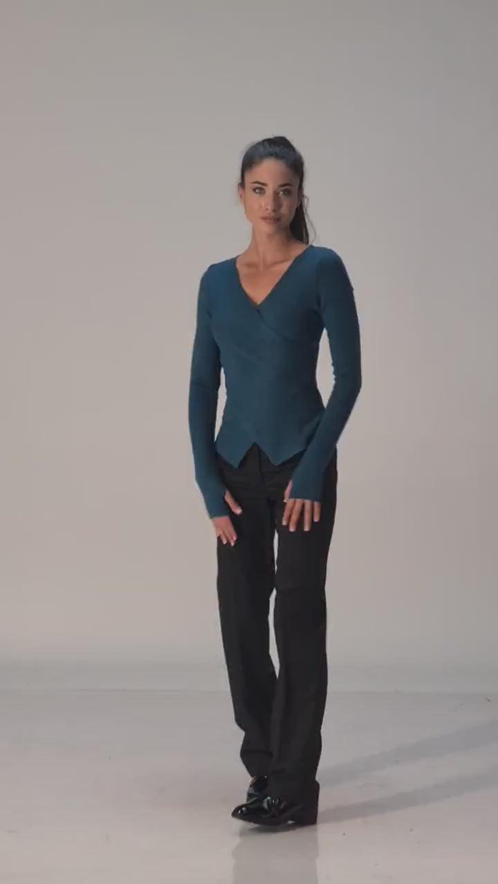 Wool Fitted Wrap Teal Blue Sweater with Thumb Holes